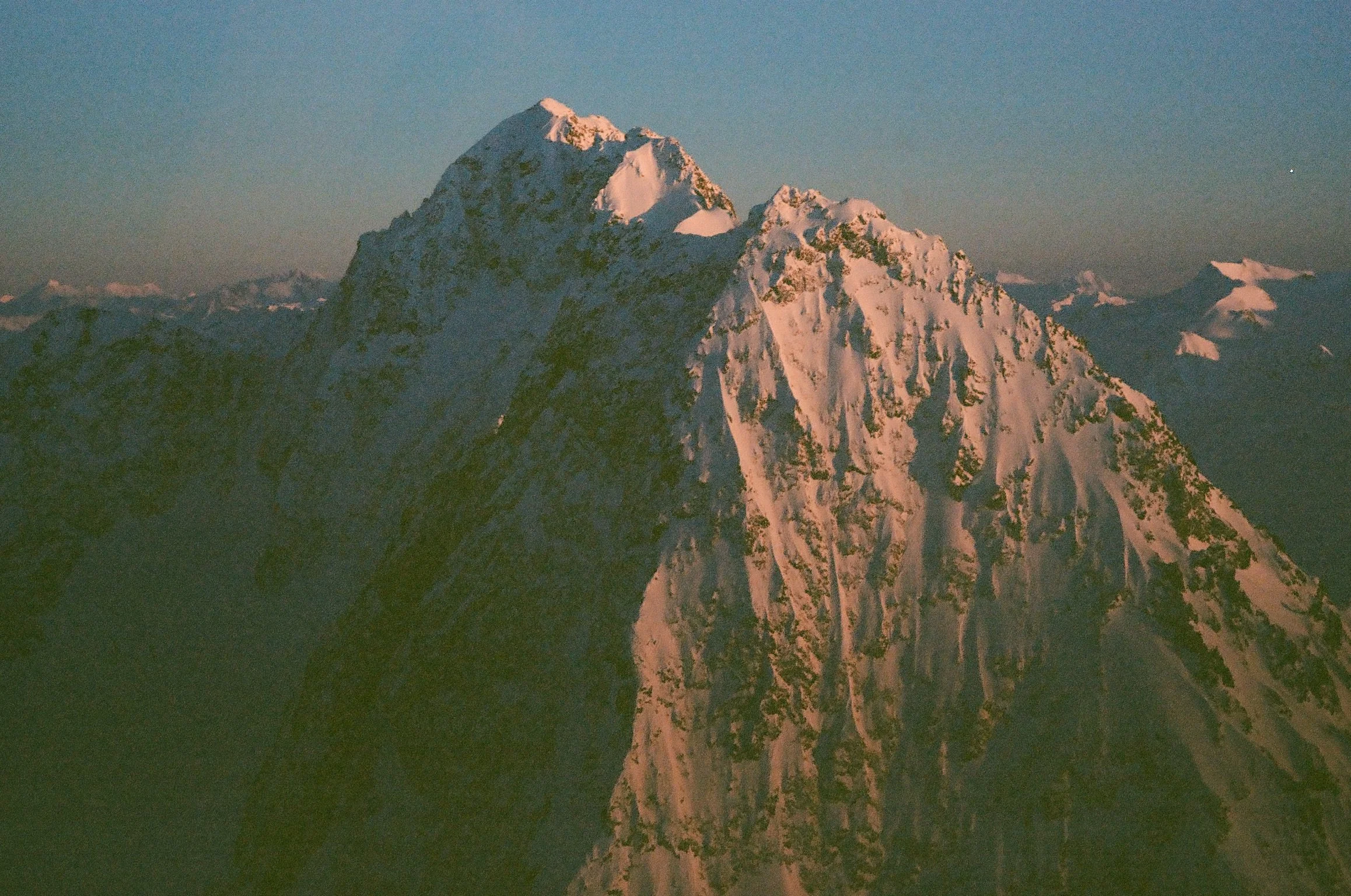 A film photos shot out of the airplane window as the last light of winter hits one of the highest peaks in the Chugach front range behind Eagle River, Alaska.